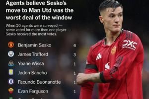 20位经纪人中,有6位将英超夏窗最差转会投给了曼联花费7650万欧元签下舍什科。一位经纪人表示:“转会费太高而且时机过早。”另一位声称:“曼联是被迫完成这笔签约的。”第三位则评价道:“花费如此高的转会费,只换来了平庸的战力。”